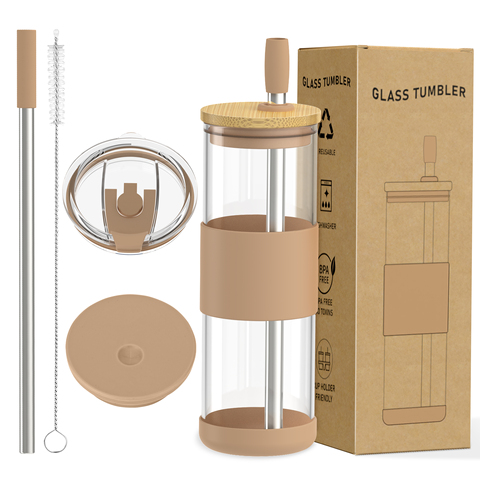 Silikon kol cam bardak geri dönüşümlü kahve su şişesi bardak cam pipetli bardak ve bambu kapak